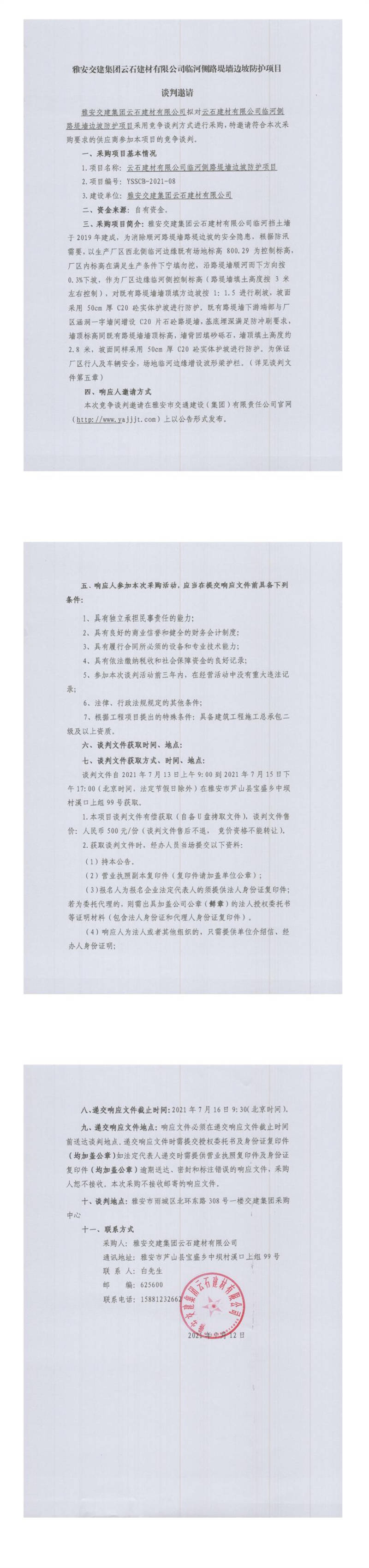 雅安交建集團云石建材有限公司臨河側(cè)路堤墻邊坡防護項目競爭談判公告