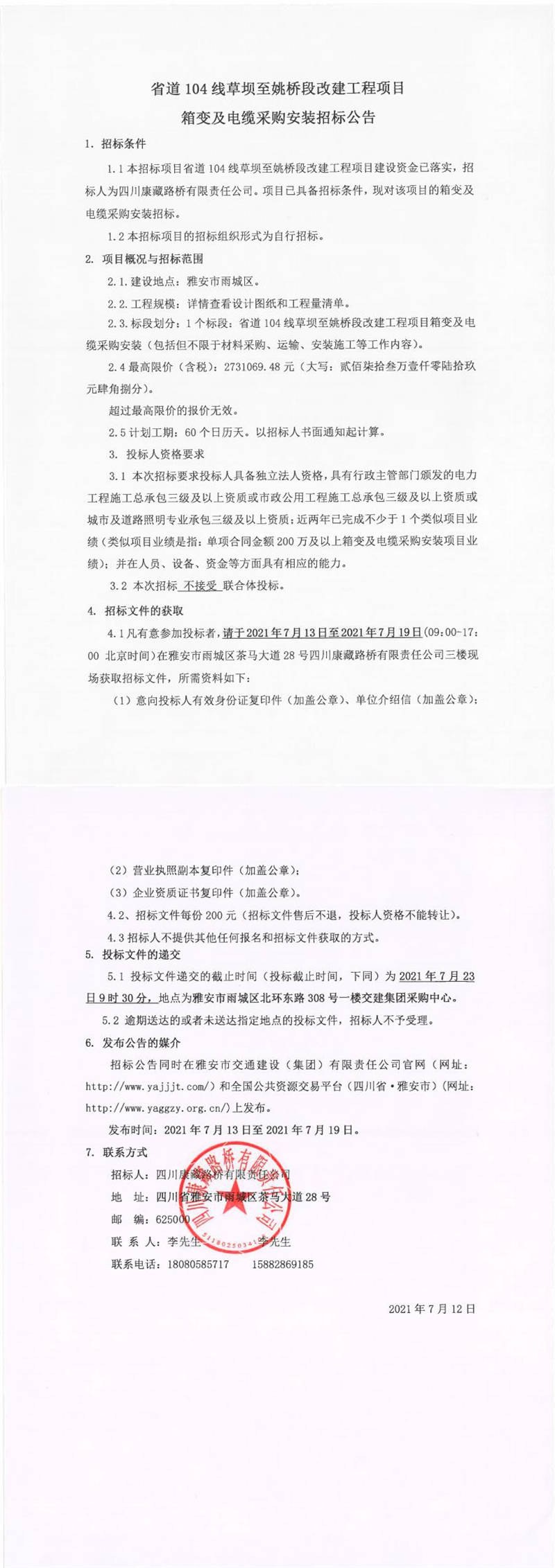四川康藏路橋有限責任公司省道104線草壩至姚橋段改建項目箱變及電纜采購安裝招標公告
