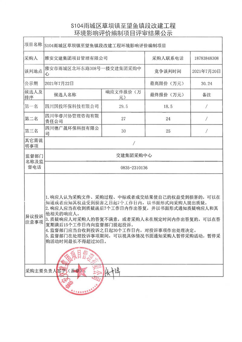 雅安交建集團項目管理有限公司S104雨城區(qū)草壩鎮(zhèn)至望魚鎮(zhèn)段改建工程水土保持方案編制服務(wù)項目評審結(jié)果公示
