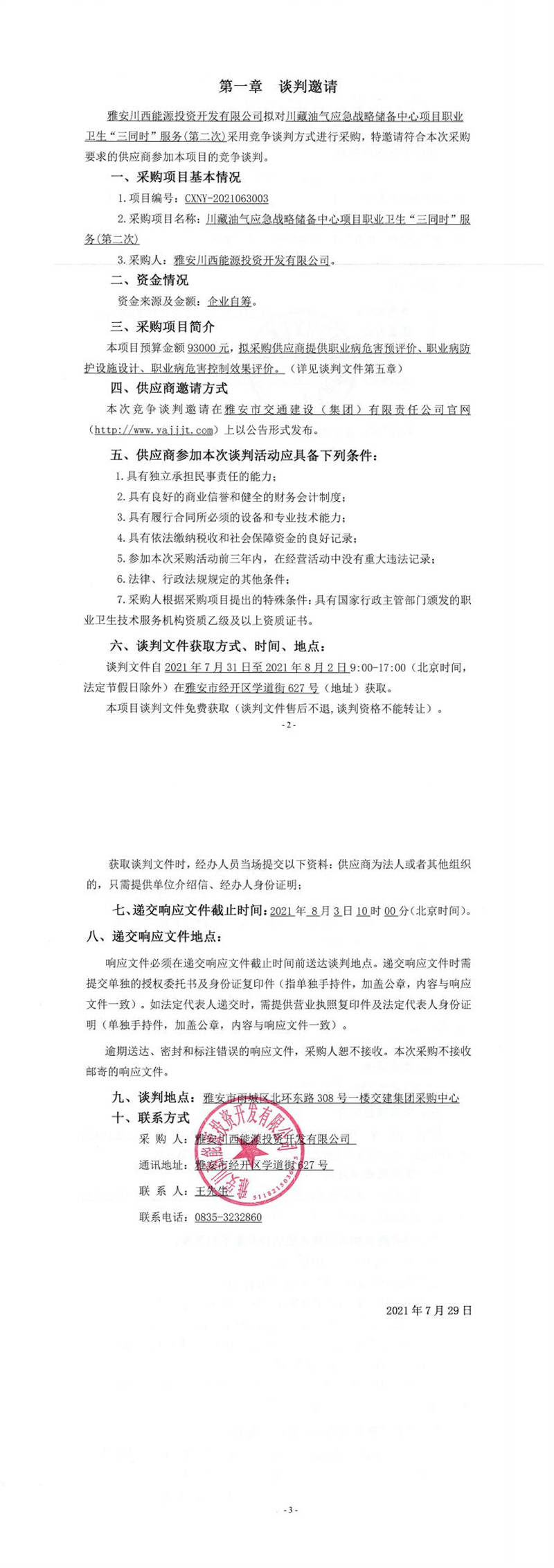 雅安川西能源投資開發(fā)有限公司川藏油氣應急戰(zhàn)略儲備中心項目職業(yè)衛(wèi)生“三同時”服務(第二次)競爭談判公告
