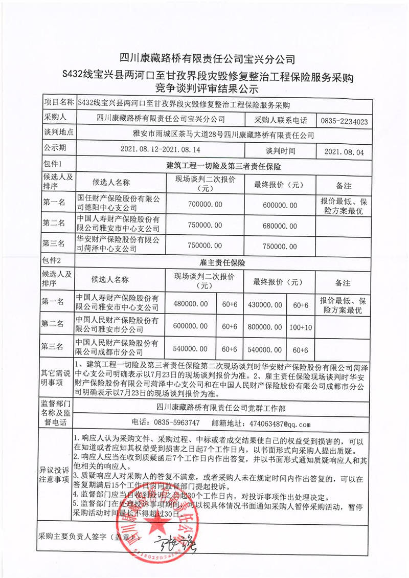 四川康藏路橋有限責(zé)任公司寶興分公司S432線寶興縣兩河口至甘孜界段災(zāi)毀修復(fù)整治工程保險服務(wù)采購競爭談判評審結(jié)果公示