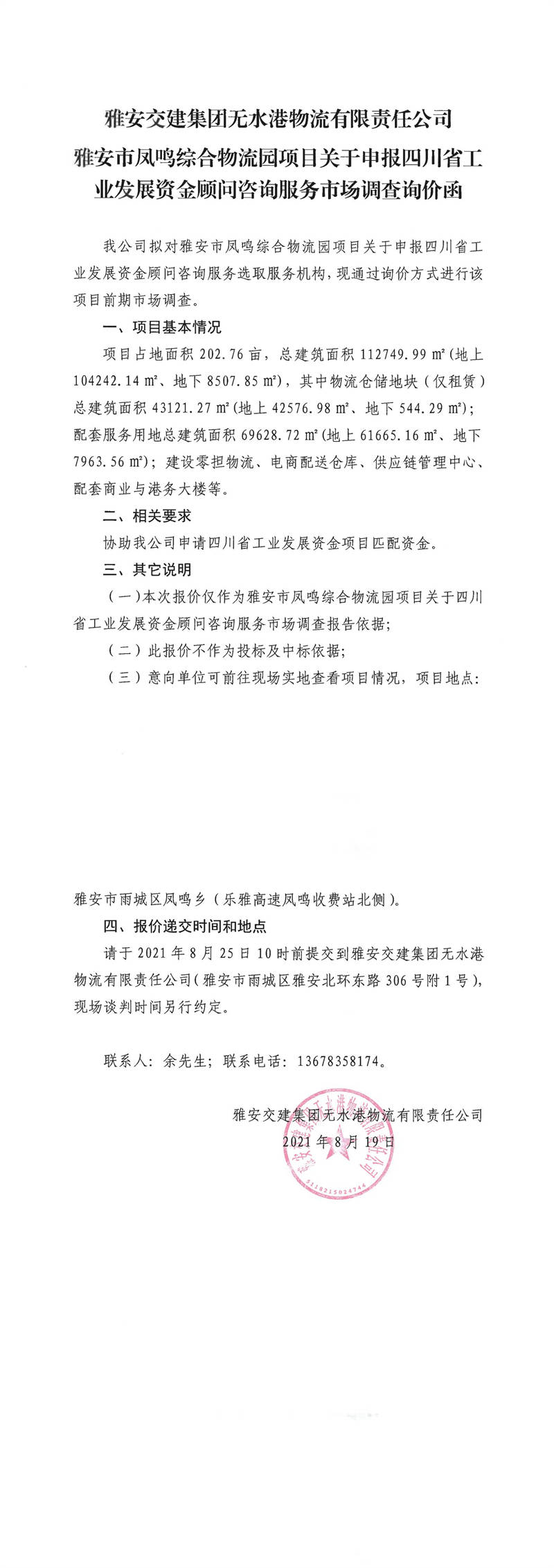 雅安交建集團(tuán)無(wú)水港物流有限責(zé)任公司雅安市鳳鳴綜合物流園項(xiàng)目關(guān)于申報(bào)四川省工業(yè)發(fā)展資金顧問(wèn)咨詢(xún)服務(wù)市場(chǎng)調(diào)查詢(xún)價(jià)函