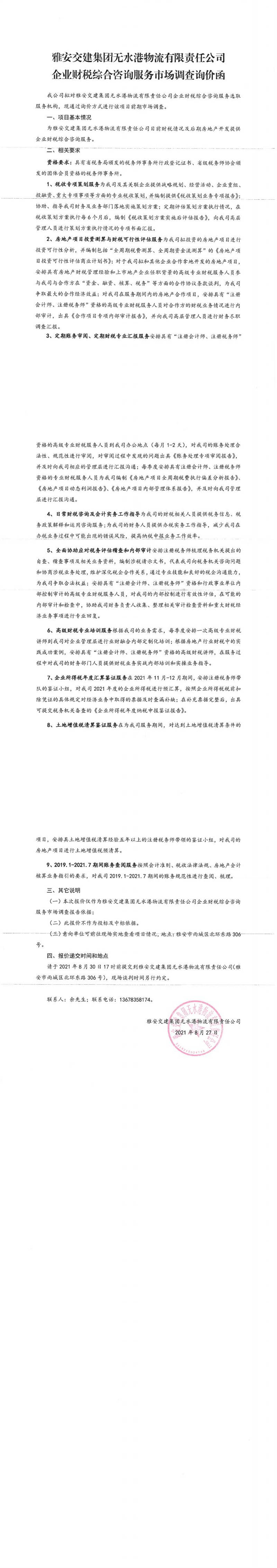 雅安交建集團(tuán)無水港物流有限責(zé)任公司企業(yè)財稅綜合咨詢服務(wù)市場調(diào)查詢價函