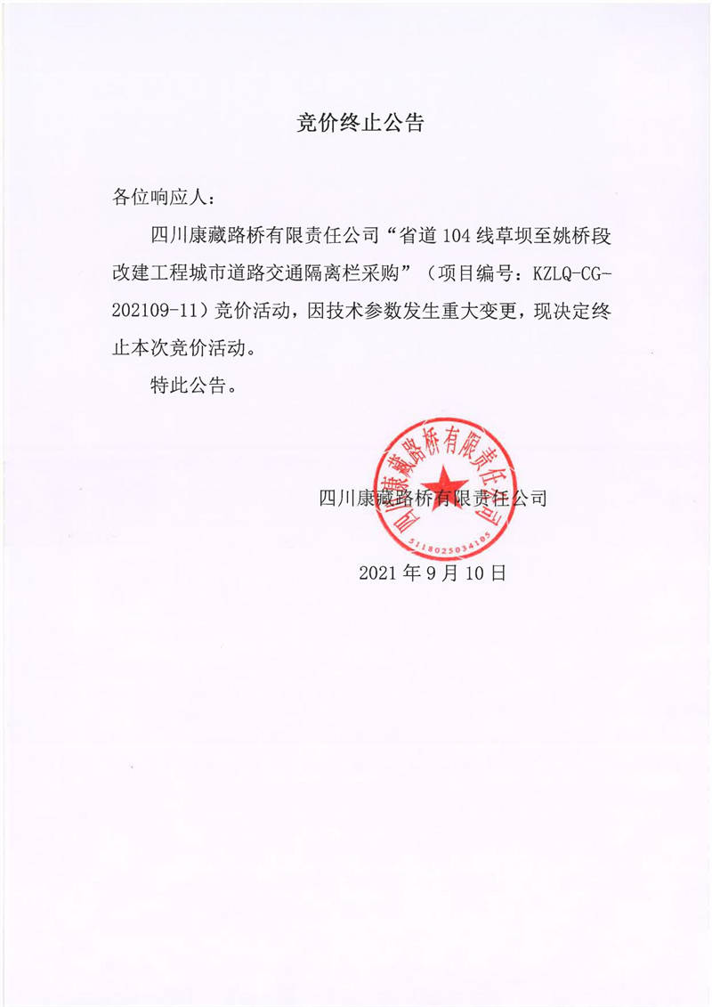 四川康藏路橋有限責任公司省道104線草壩至姚橋段改建工程城市道路交通隔離欄采購競價終止公告