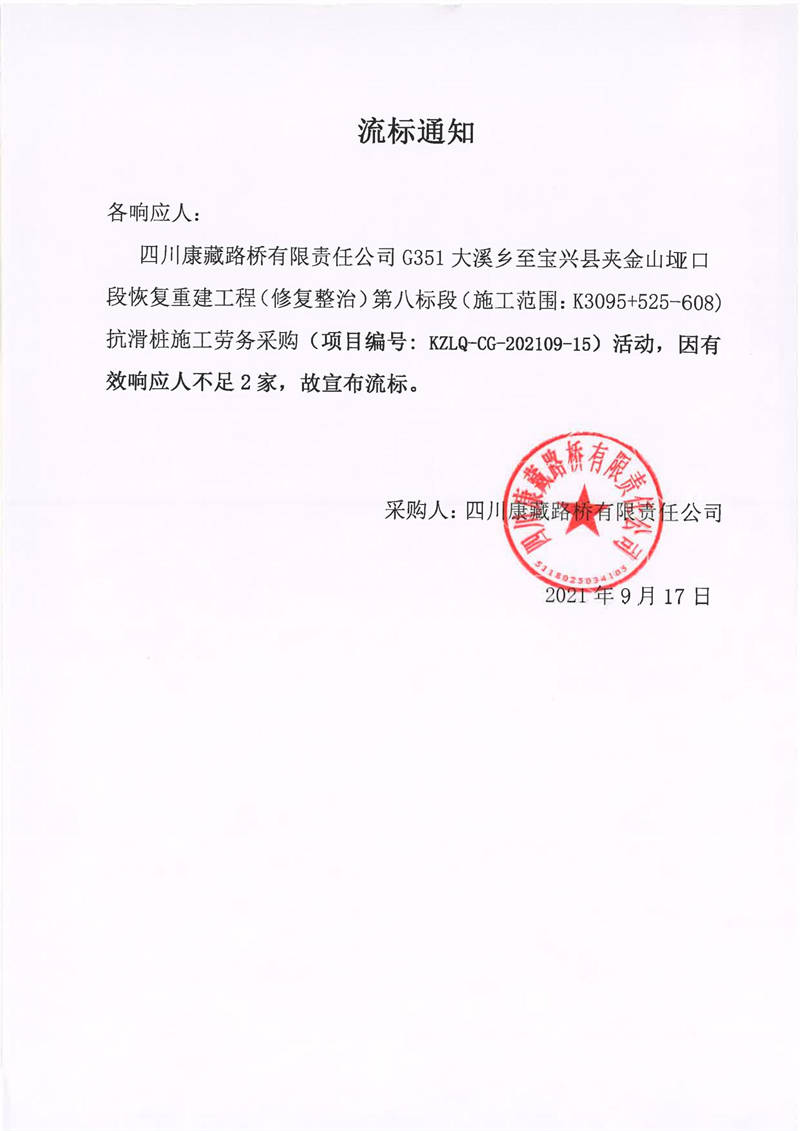 四川康藏路橋有限責任公司G351大溪鄉(xiāng)至寶興縣夾金山埡口段恢復重建工程(修復整治)第八標段(施工范圍:K3095+525-608)抗滑樁施工勞務(wù)采購流標通知