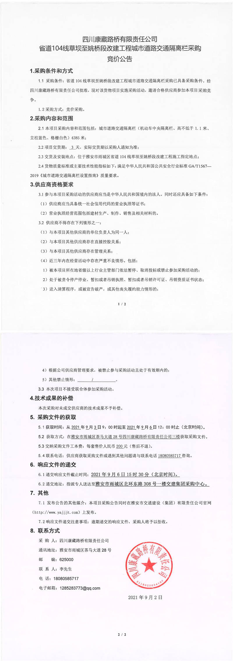 四川康藏路橋有限責(zé)任公司省道104線草壩至姚橋段改建工程城市道路交通隔離欄采購競價公告