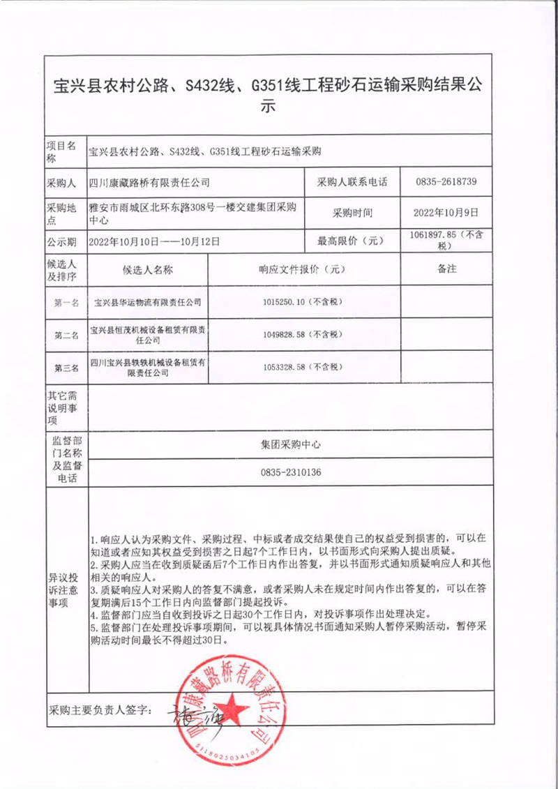 四川康藏路橋有限責(zé)任公司寶興縣農(nóng)村公路、S432線、G351線工程砂石運輸采購結(jié)果公示