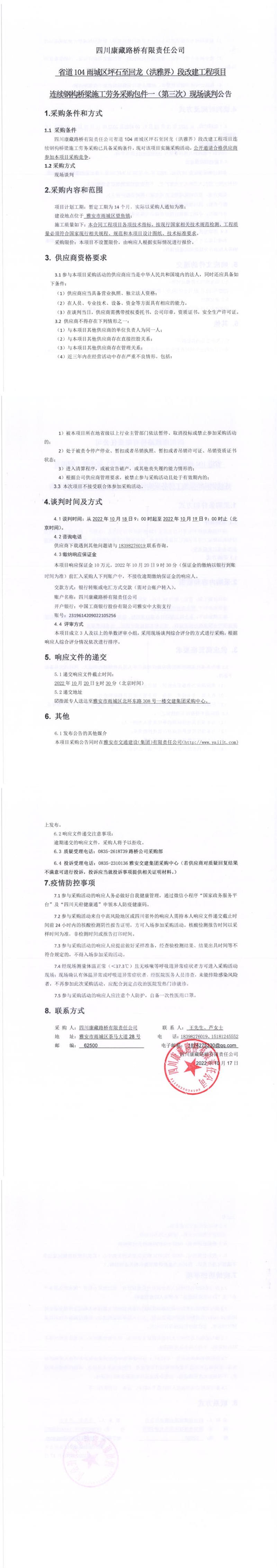 四川康藏路橋有限責(zé)任公司省道104雨城區(qū)坪石至回龍(洪雅界)段改建工程項目連續(xù)鋼構(gòu)橋梁施工勞務(wù)采購包件一(第三次)現(xiàn)場談判公告