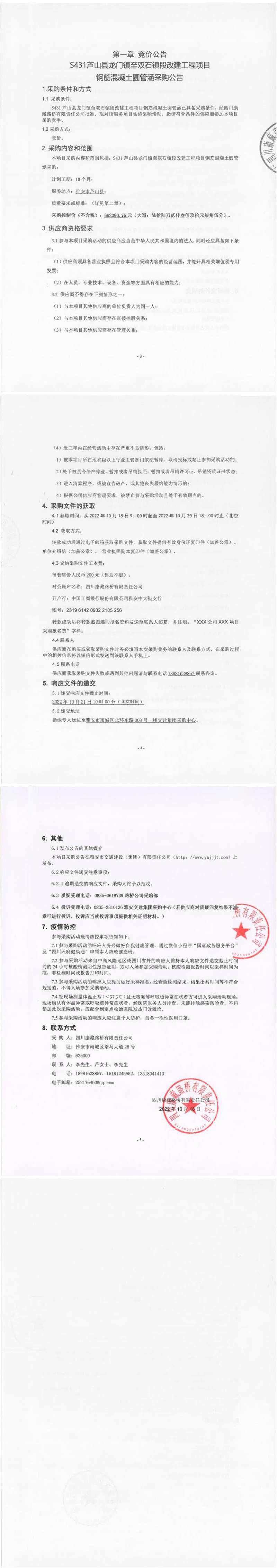 四川康藏路橋有限責(zé)任公司S431蘆山縣龍門鎮(zhèn)至雙石鎮(zhèn)段改建工程項(xiàng)目鋼筋混凝土圓管涵采購(gòu)公告