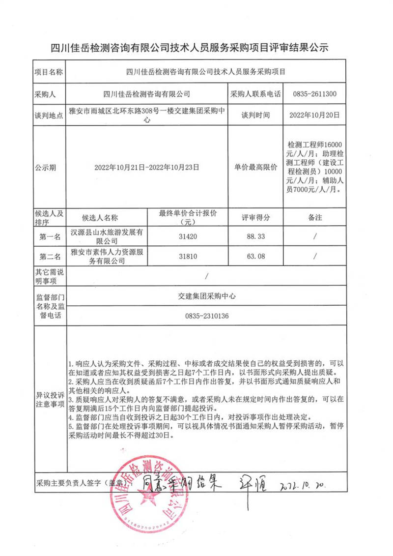 四川佳岳檢測(cè)咨詢有限公司技術(shù)人員服務(wù)采購(gòu)項(xiàng)目評(píng)審結(jié)果公示