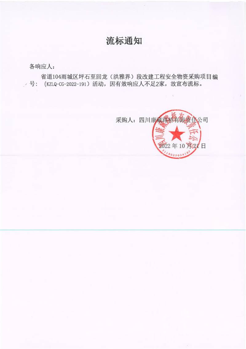 四川康藏路橋有限責(zé)任公司省道104雨城區(qū)坪石至回龍(洪雅界)段改建工程項(xiàng)目安全物資采購(gòu)項(xiàng)目流標(biāo)通知
