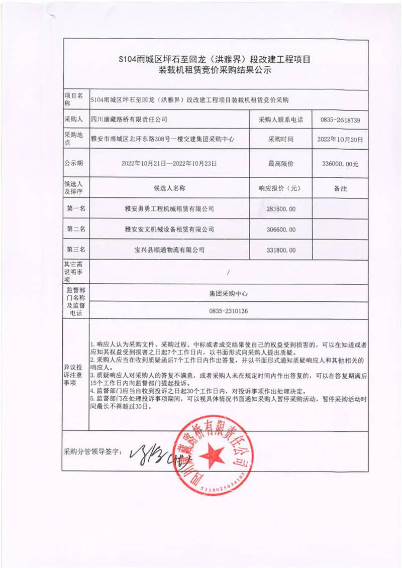 四川康藏路橋有限責(zé)任公司S104雨城區(qū)坪石至回龍(洪雅界)段改建工程項(xiàng)目裝載機(jī)租賃競價(jià)采購結(jié)果公示