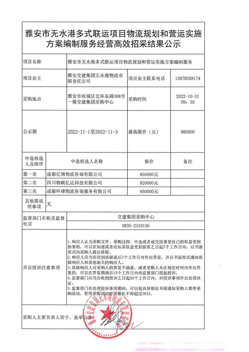 雅安交建集團(tuán)無水港物流有限責(zé)任公司雅安市無水港多式聯(lián)運(yùn)項目物流規(guī)劃和營運(yùn)實(shí)施方案編制服務(wù)經(jīng)營高效招采結(jié)果公示