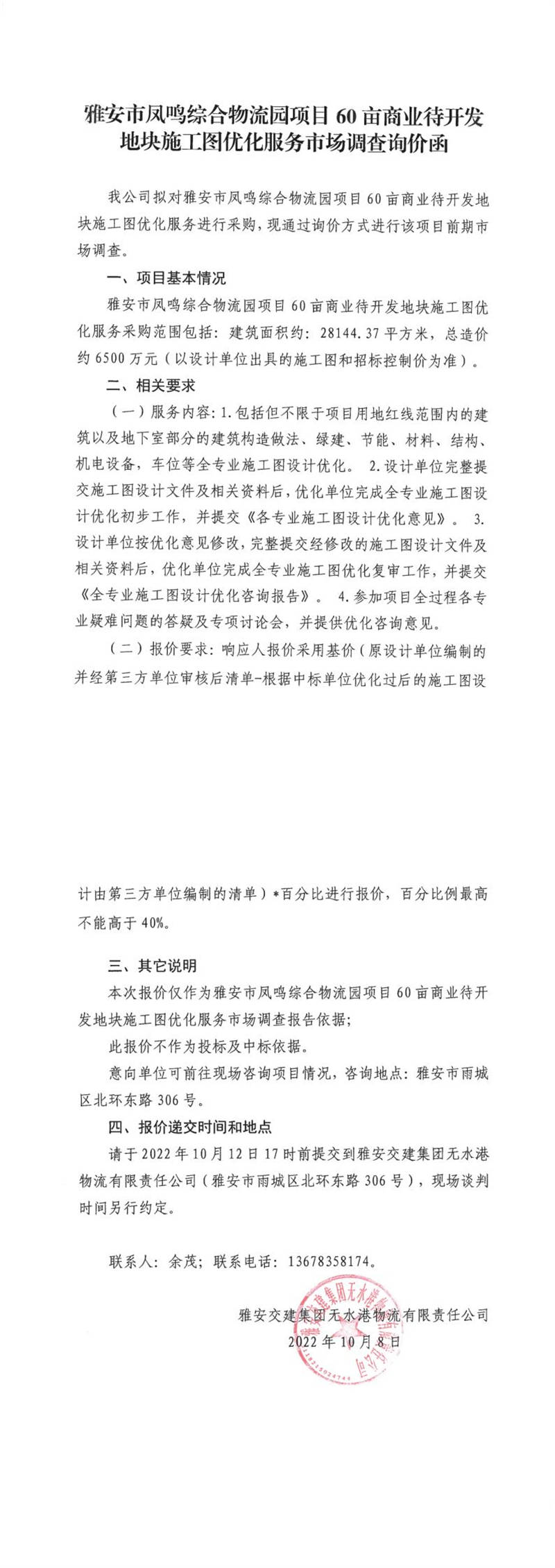 雅安交建集團(tuán)無水港物流有限責(zé)任公司雅安市鳳鳴綜合物流園項(xiàng)目60畝商業(yè)待開發(fā)地塊施工圖優(yōu)化服務(wù)市場調(diào)查詢價(jià)函