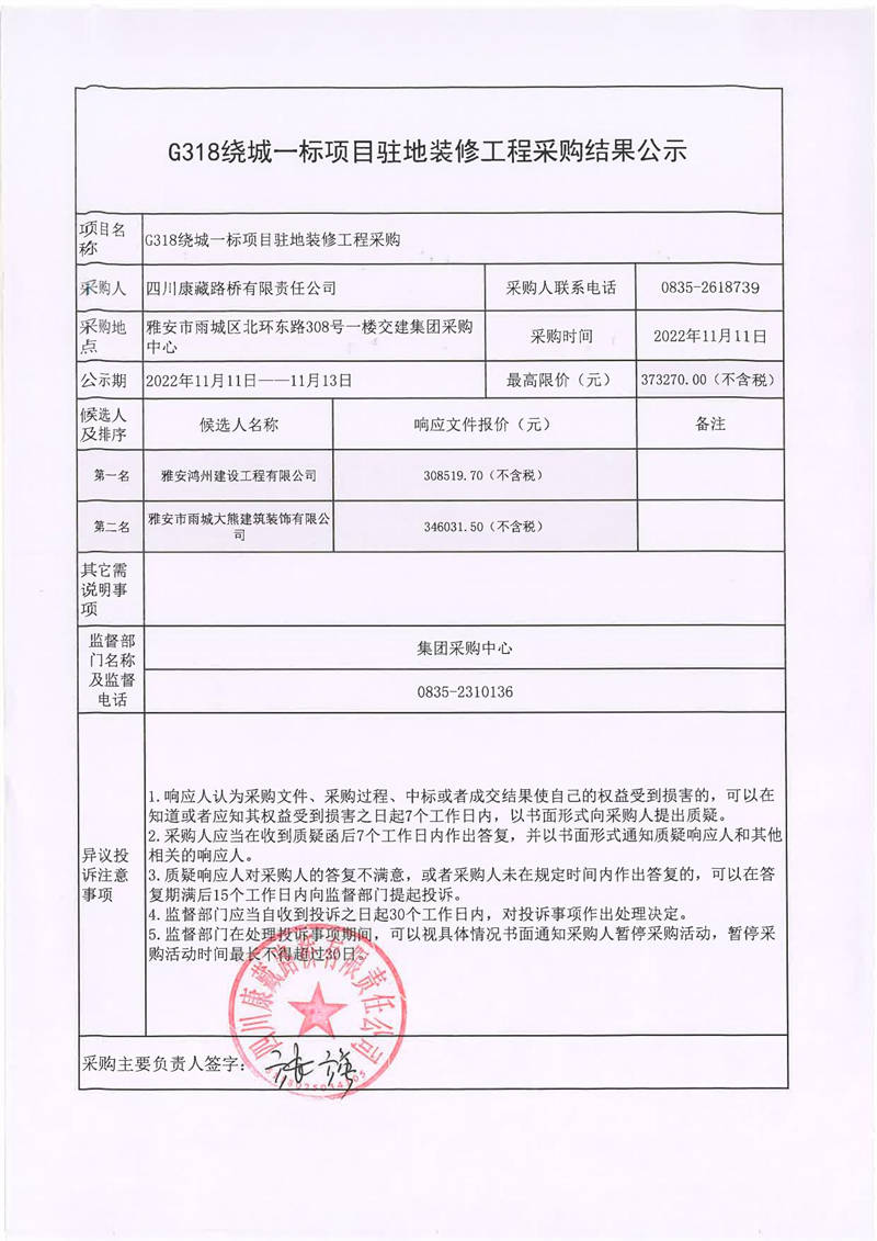 四川康藏路橋有限責任公司G318繞城一標項目駐地裝修工程采購結(jié)果公示