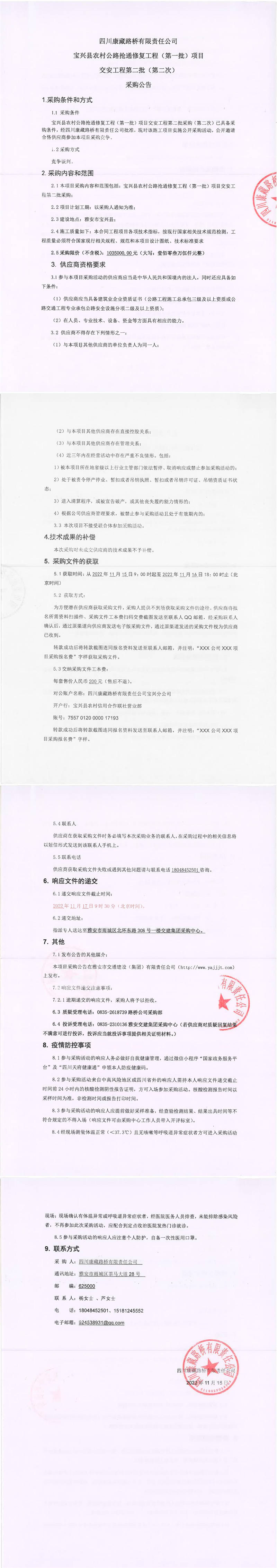 四川康藏路橋有限責(zé)任公司寶興縣農(nóng)村公路搶通修復(fù)工程(第一批)項(xiàng)目交安工程第二批(第二次)采購(gòu)公告