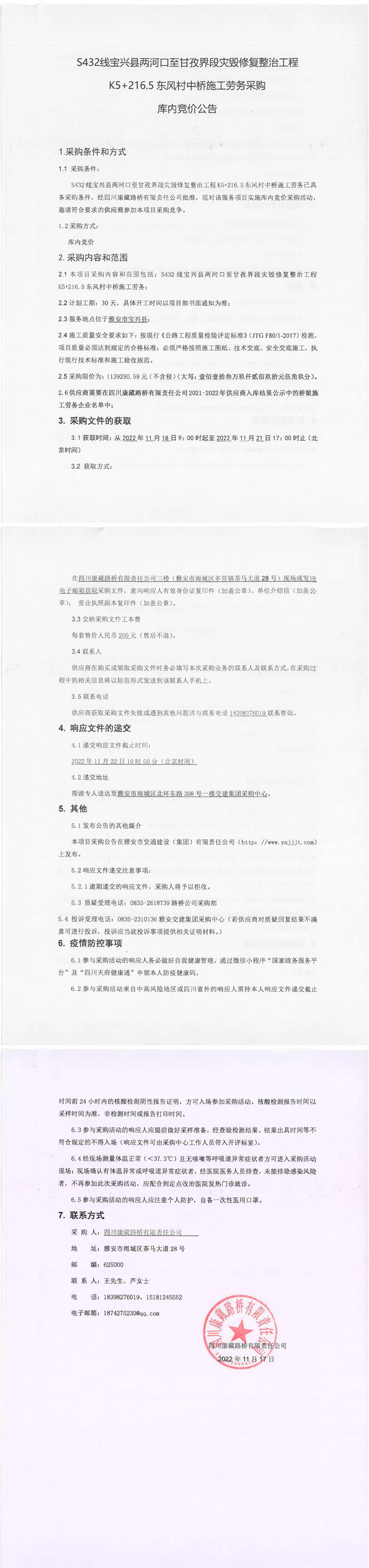 四川康藏路橋有限責任公司S432線寶興縣兩河口至甘孜界段災(zāi)毀修復(fù)整治工程K5+216.5東風村中橋施工勞務(wù)采購庫內(nèi)競價公告