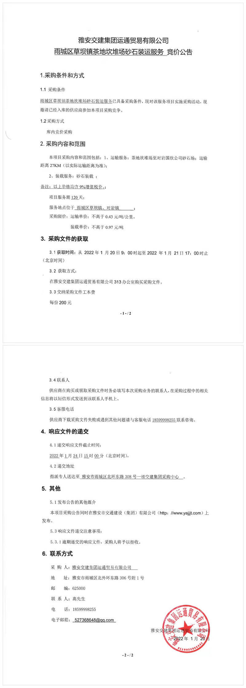 雅安交建集團(tuán)運通貿(mào)易有限公司雨城區(qū)草壩鎮(zhèn)茶地坎堆場砂石裝運服務(wù)競價公告