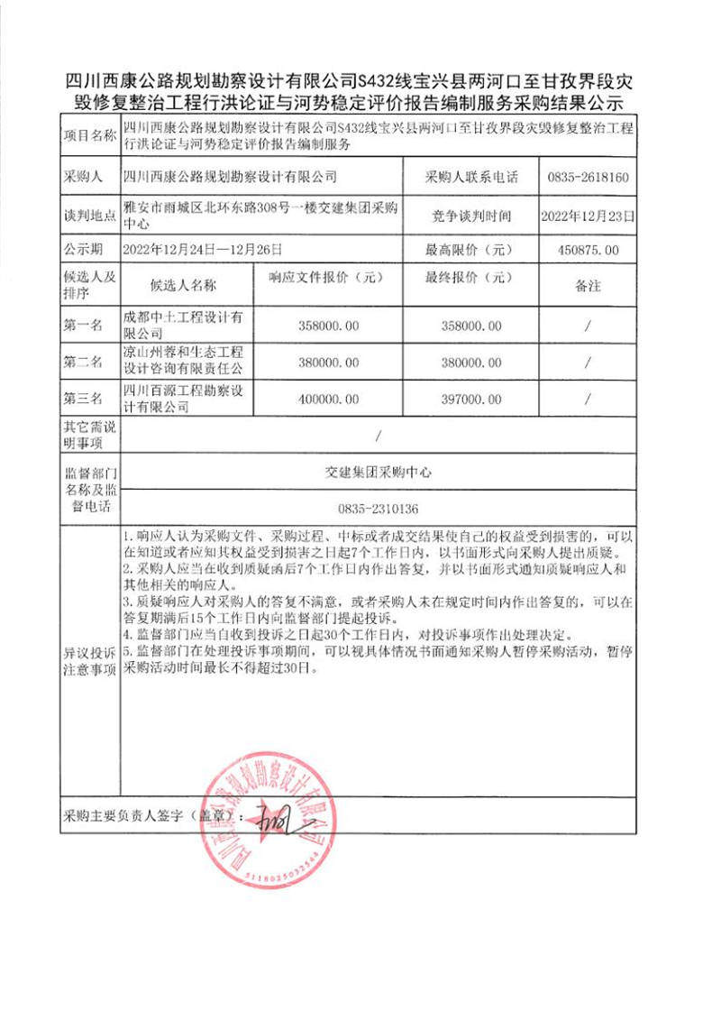 四川西康公路規(guī)劃勘察設(shè)計有限公司S432線寶興縣兩河口至甘孜界段災毀修復整治工程行洪論證與河勢穩(wěn)定評價報告編制服務(wù)采購結(jié)果公示