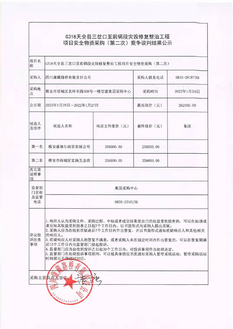 四川康藏路橋有限責任公司G318天全縣三岔口至前碉段災(zāi)毀修復(fù)整治工程項目安全物資采購(第二次)競爭談判結(jié)果公示