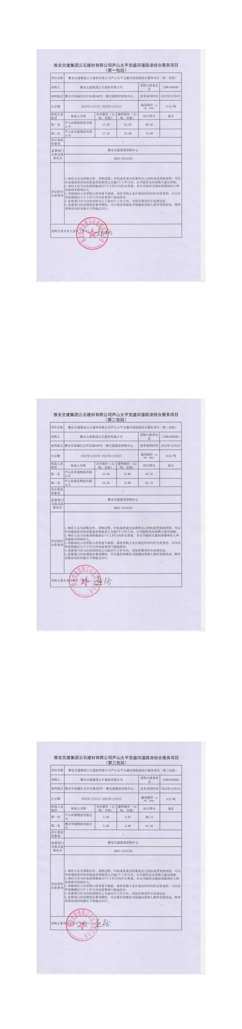 雅安交建集團(tuán)云石建材有限公司蘆山太平寶盛河道疏浚綜合服務(wù)項(xiàng)目(第一包段、第二包段、第三包段)結(jié)果公示