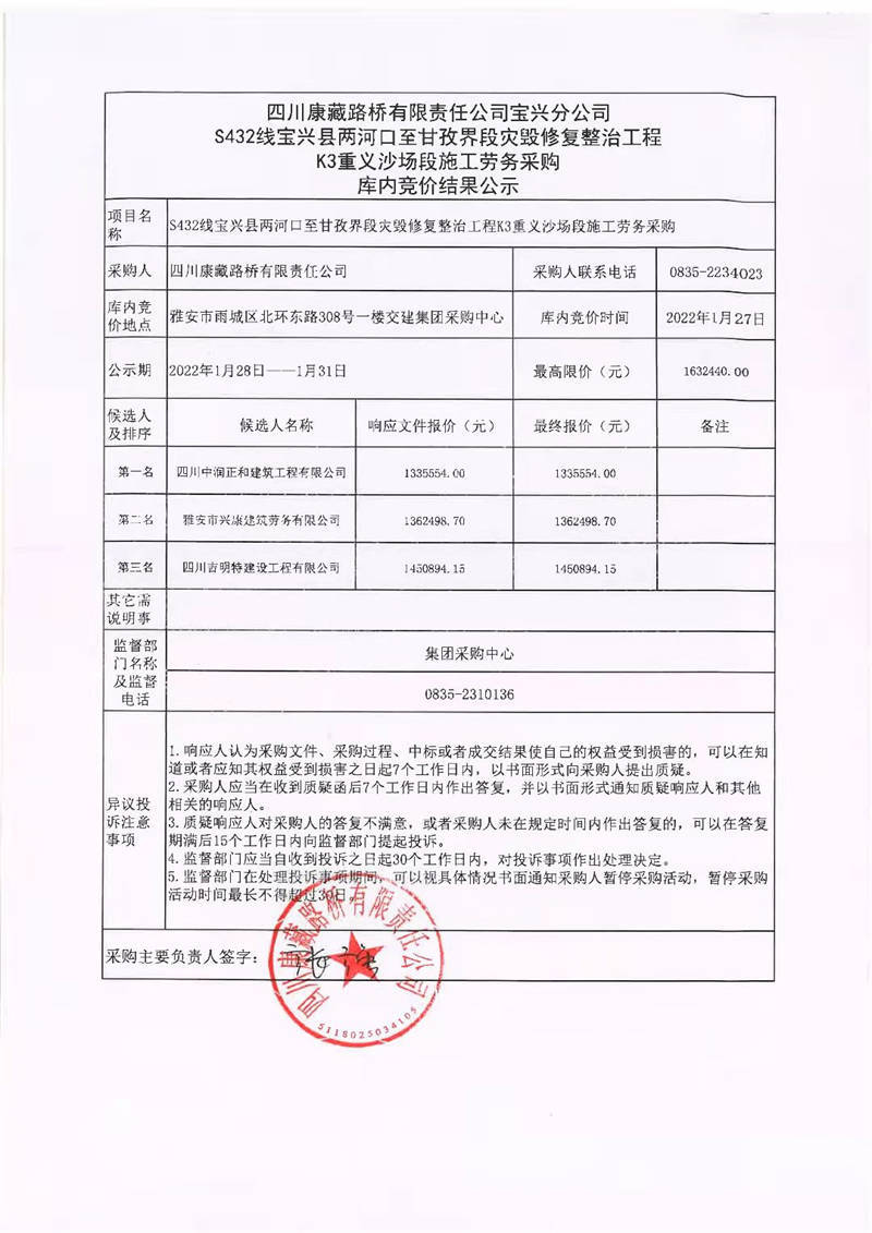 四川康藏路橋有限責(zé)任公司寶興分公司S432線寶興縣兩河口至甘孜界段災(zāi)毀修復(fù)整治工程K3重義沙場段施工勞務(wù)采購庫內(nèi)競價結(jié)果公示