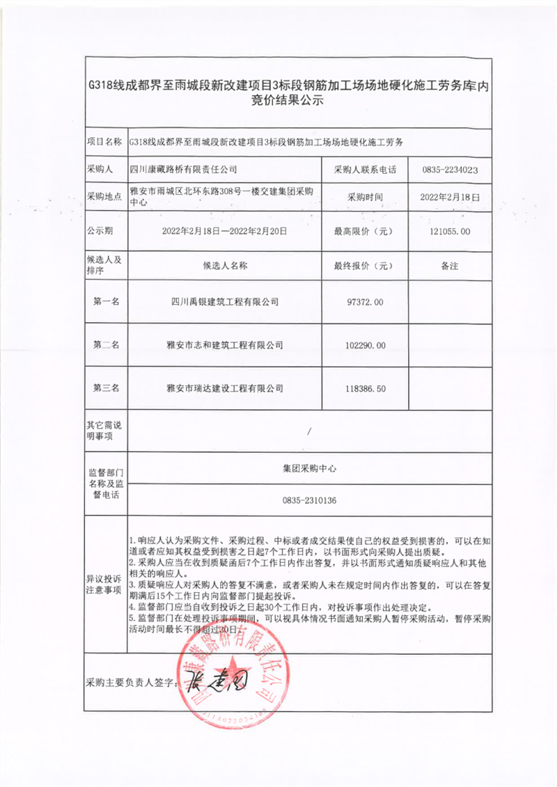 四川康藏路橋有限責(zé)任公司G318線成都界至雨城段新改建項(xiàng)目3標(biāo)段鋼筋加工場(chǎng)場(chǎng)地硬化施工勞務(wù)庫內(nèi)競(jìng)價(jià)結(jié)果公示