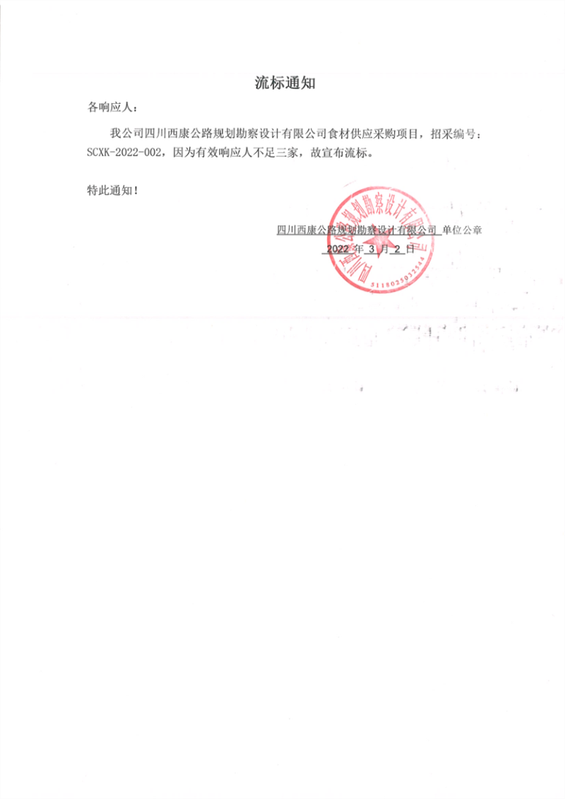 四川西康公路規(guī)劃勘察設(shè)計(jì)有限公司食材供應(yīng)采購項(xiàng)目流標(biāo)通知