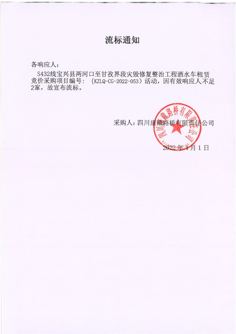四川康藏路橋有限責(zé)任公司S432線寶興縣兩河口至甘孜界段災(zāi)毀修復(fù)整治工程灑水車租賃競(jìng)價(jià)采購項(xiàng)目流標(biāo)通知