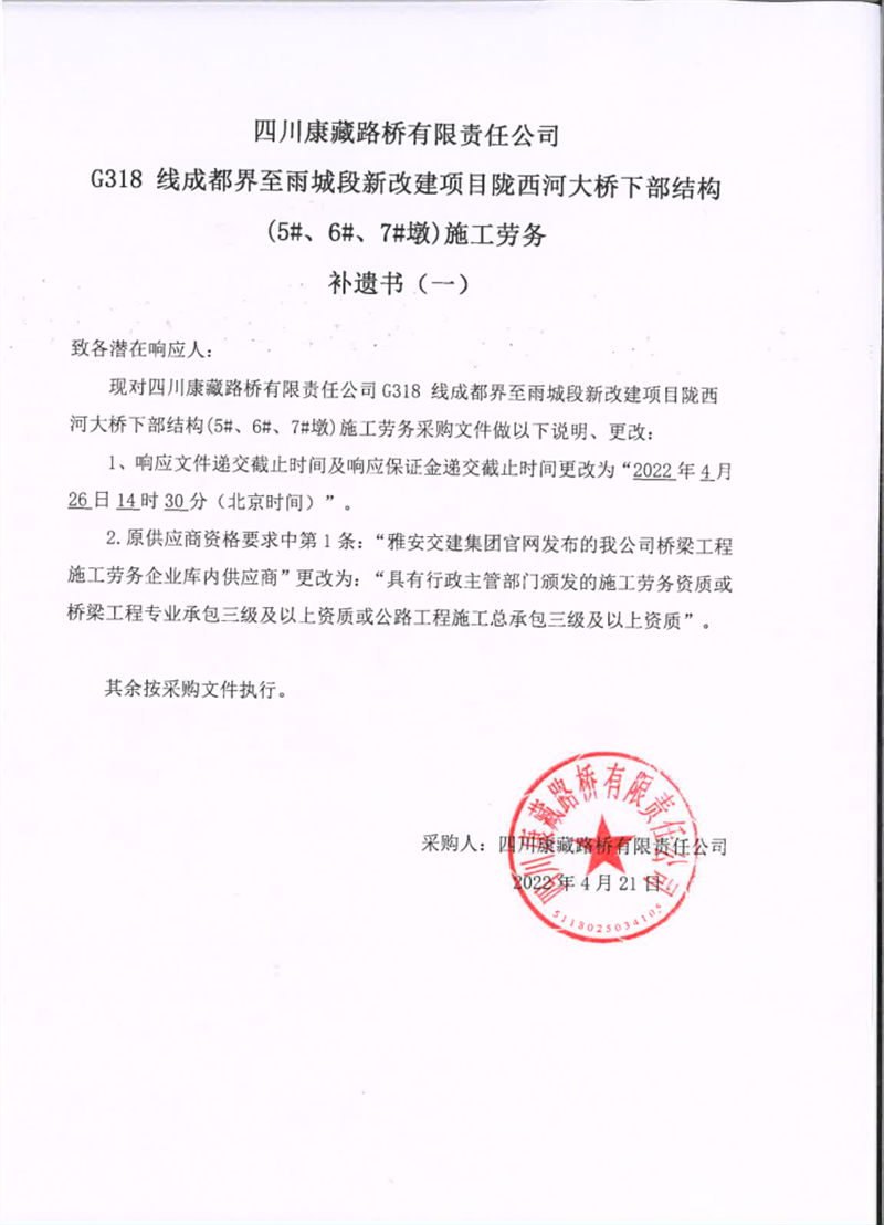 四川康藏路橋有限責(zé)任公司G318線成都界至雨城段新改建項(xiàng)目隴西河大橋下部結(jié)構(gòu)(5#、6#、7#墩)施工勞務(wù)補(bǔ)遺書(shū)(一)