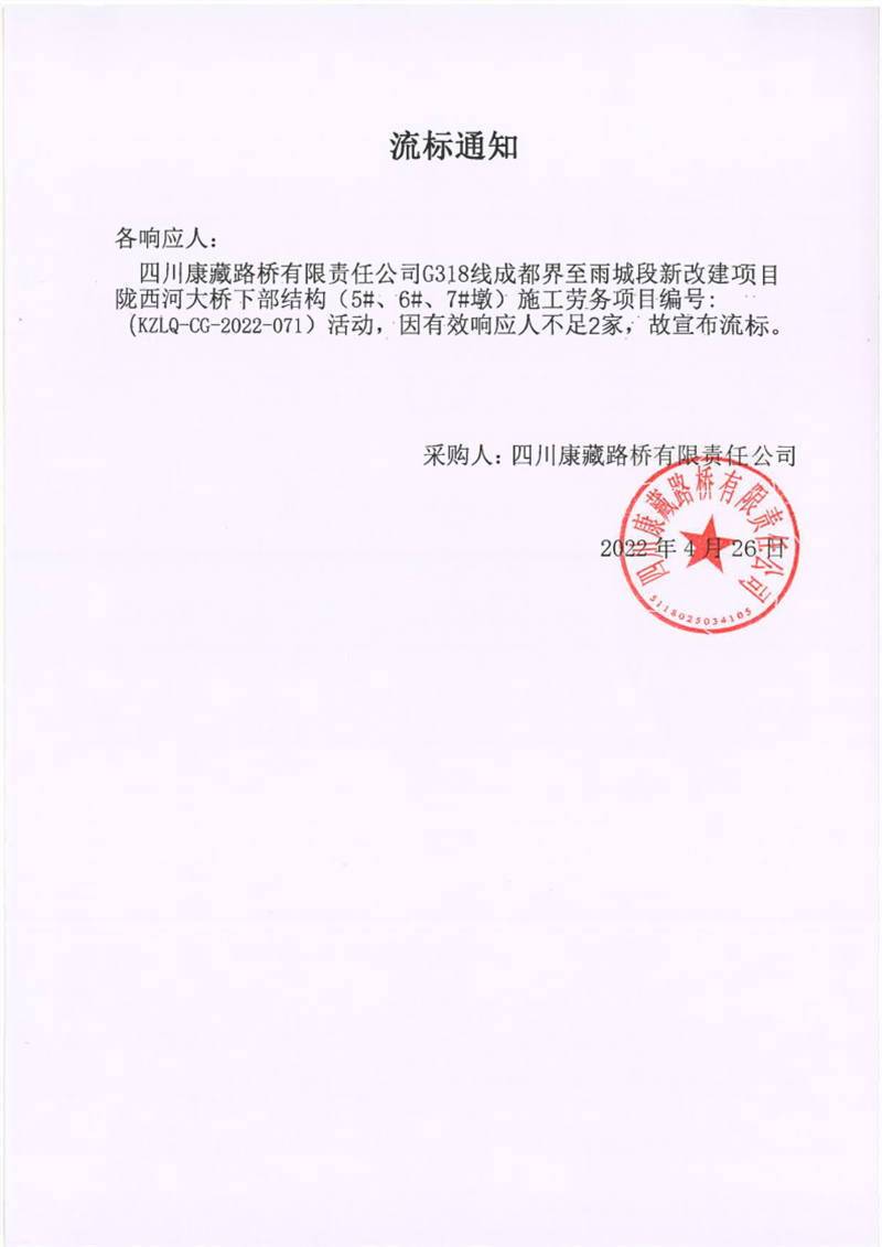 四川康藏路橋有限責(zé)任公司G318線成都界至雨城段新改建項(xiàng)目隴西河大橋下部結(jié)構(gòu)(5#、6#、7#墩)施工勞務(wù)采購流標(biāo)通知