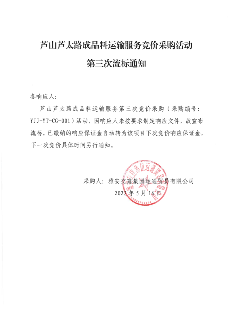 雅安交建集團運通貿(mào)易有限公司蘆山蘆太路成品料運輸服務(wù)競價采購活動第三次流標(biāo)通知