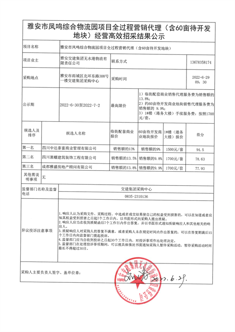 雅安交建集團(tuán)無(wú)水港物流有限責(zé)任公司雅安市鳳鳴綜合物流園項(xiàng)目全過程營(yíng)銷代理(含60畝待開發(fā)地塊)經(jīng)營(yíng)高效招采結(jié)果公示