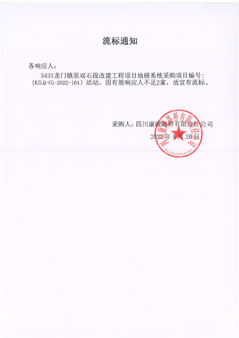 四川康藏路橋有限責(zé)任公司S431龍門鎮(zhèn)至雙石段改建工程項(xiàng)目地磅系統(tǒng)采購(gòu)項(xiàng)目流標(biāo)通知