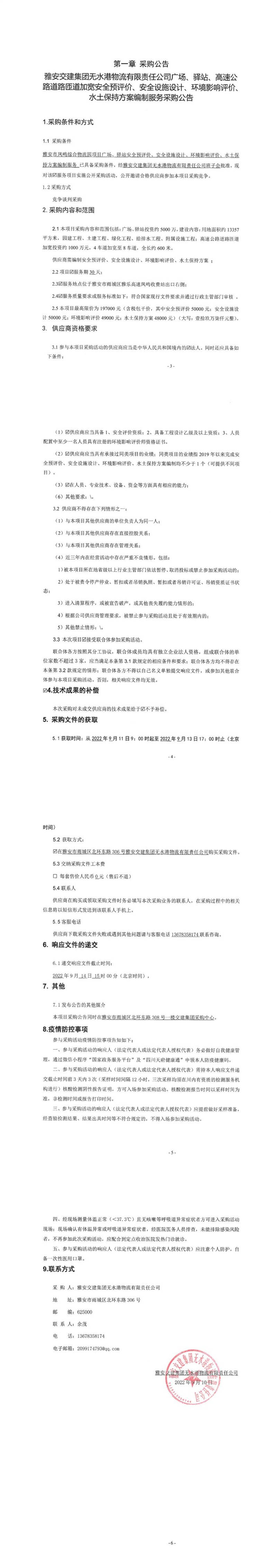 雅安交建集團(tuán)無水港物流有限責(zé)任公司廣場、驛站、高速公路道路匝道加寬安全預(yù)評價(jià)、安全設(shè)施設(shè)計(jì)、環(huán)境影響評價(jià)、水土保持方案編制服務(wù)采購公告