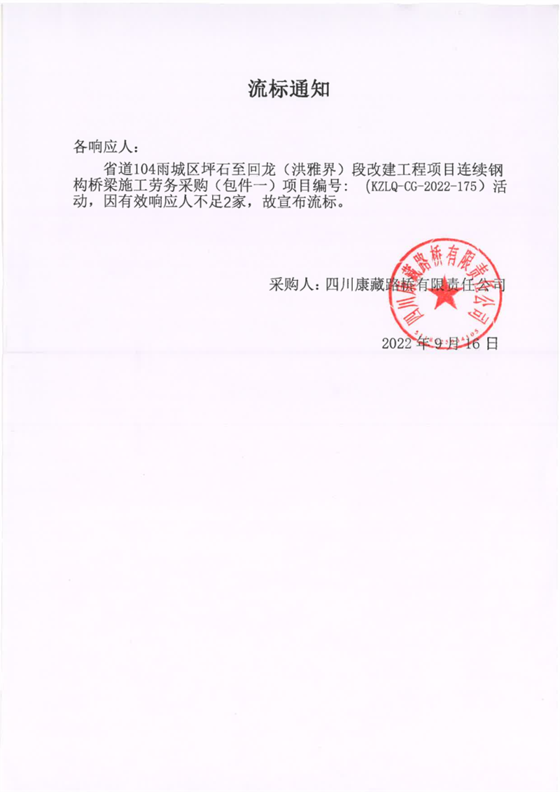 四川康藏路橋有限責(zé)任公司省道104雨城區(qū)坪石至回龍(洪雅界)段改建工程項目連續(xù)鋼構(gòu)橋梁施工勞務(wù)采購(包件一)流標(biāo)通知