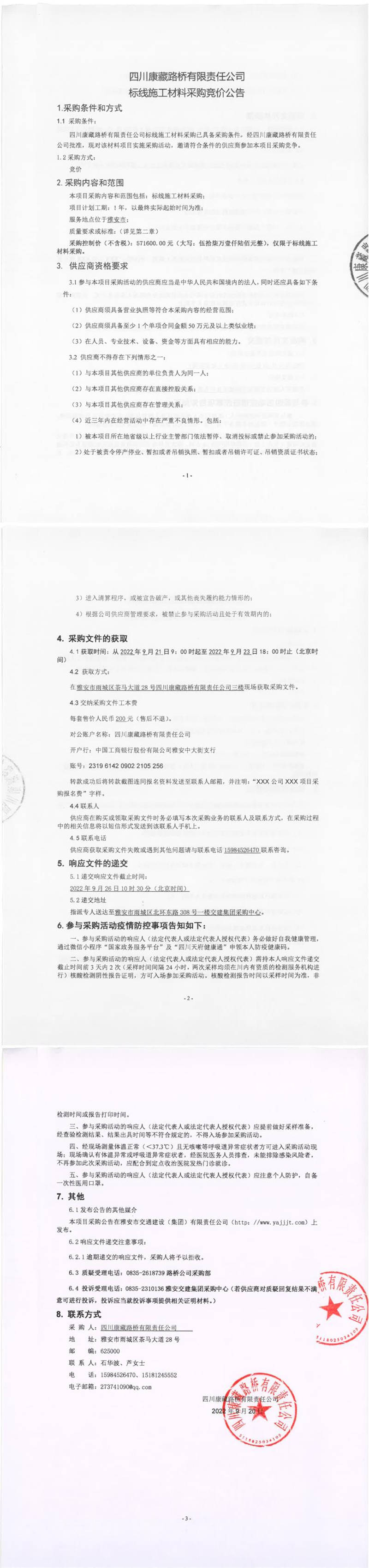 四川康藏路橋有限責(zé)任公司標(biāo)線施工材料采購(gòu)競(jìng)價(jià)公告