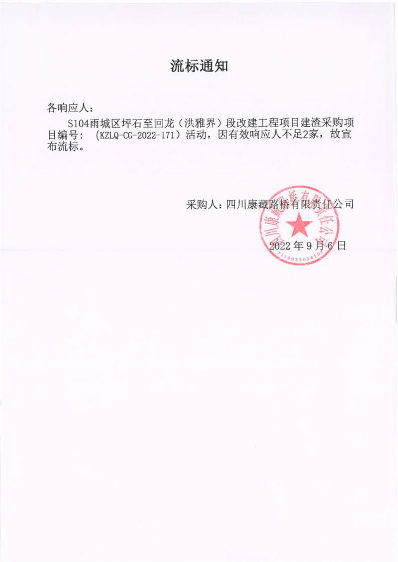 四川康藏路橋有限責(zé)任公司S104雨城區(qū)坪石至回龍(洪雅界)段改建工程項(xiàng)目建渣采購項(xiàng)目流標(biāo)通知