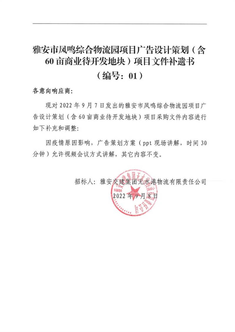 雅安交建集團無水港物流有限責任公司雅安市鳳鳴綜合物流園項目廣告設(shè)計策劃(含60畝商業(yè)待開發(fā)地塊)項目文件補遺書(編號:01)