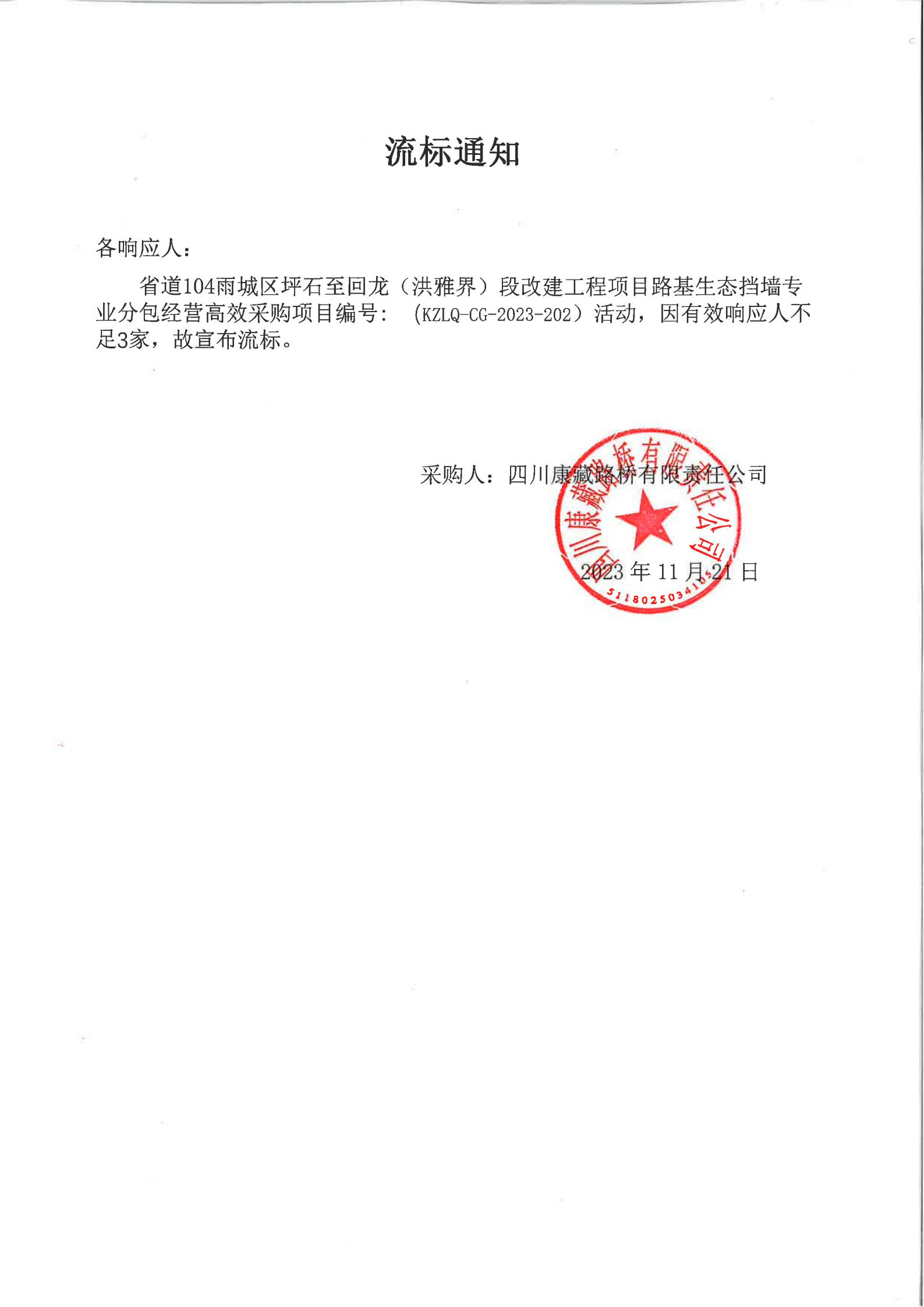 四川康藏路橋有限責任公司省道104雨城區(qū)坪石至回龍(洪雅界)段改建工程項目路基生態(tài)擋墻專業(yè)分包經(jīng)營高效采購流標通知
