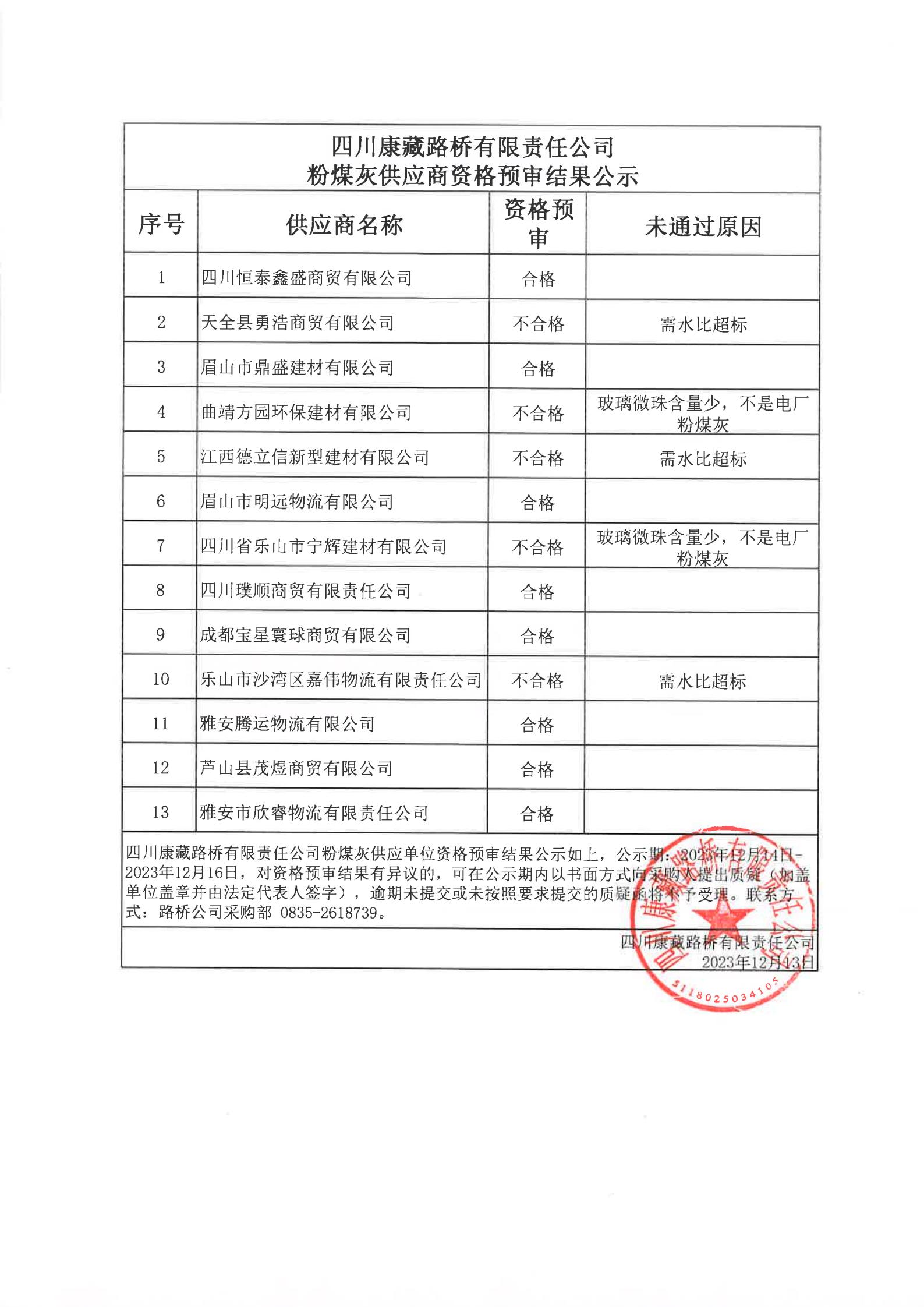 四川康藏路橋有限責任公司粉煤灰供應商資格預審結(jié)果公示