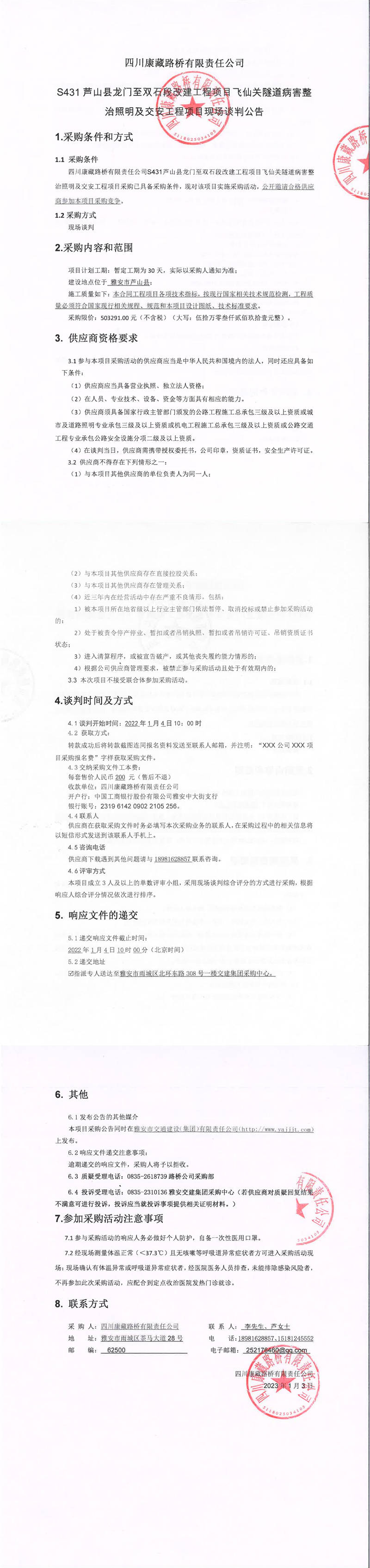 四川康藏路橋有限責(zé)任公司S431蘆山縣龍門(mén)至雙石段改建工程項(xiàng)目飛仙關(guān)隧道病害整治照明及交安工程項(xiàng)目現(xiàn)場(chǎng)談判公告