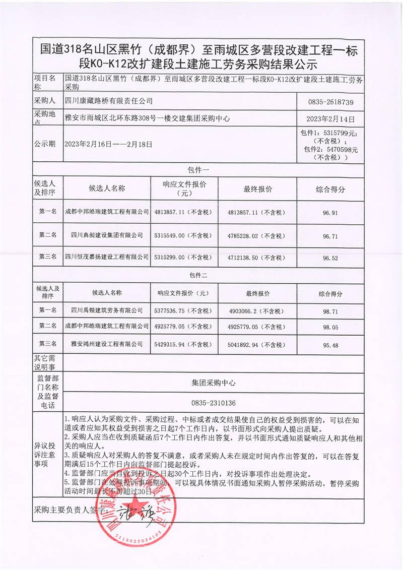 四川康藏路橋有限責(zé)任公司國道318名山區(qū)黑竹(成都界)至雨城區(qū)多營段改建工程一標(biāo)段K0-K12改擴(kuò)建段土建施工勞務(wù)采購結(jié)果公示