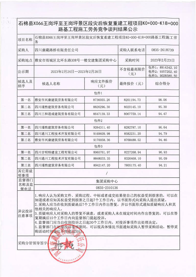 四川康藏路橋有限責任公司石棉縣X066王崗坪至王崗坪景區(qū)段災(zāi)后恢復(fù)重建工程項目土石方工程、排水工程、邊坡治理工程、防護工程施工勞務(wù)采購項目競爭談判結(jié)果公示