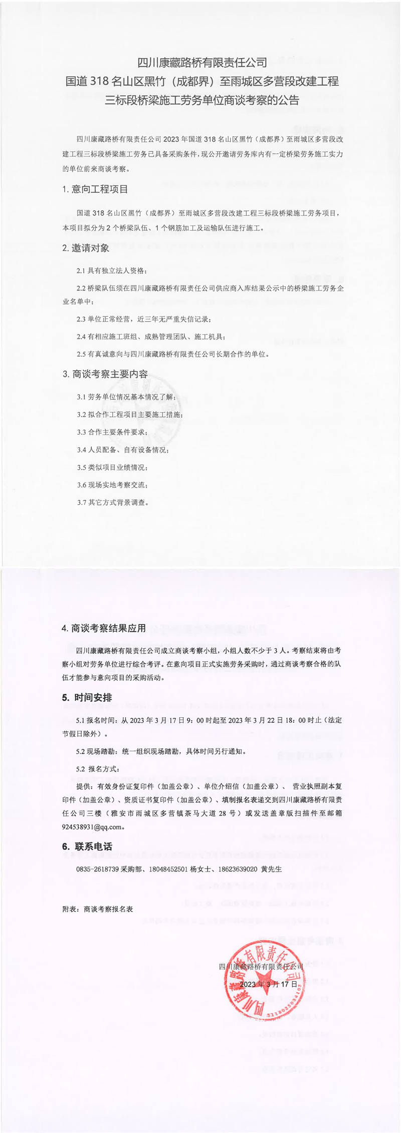 四川康藏路橋有限責(zé)任公司國道318名山區(qū)黑竹(成都界)至雨城區(qū)多營段改建工程三標(biāo)段橋梁施工勞務(wù)單位商談考察的公告