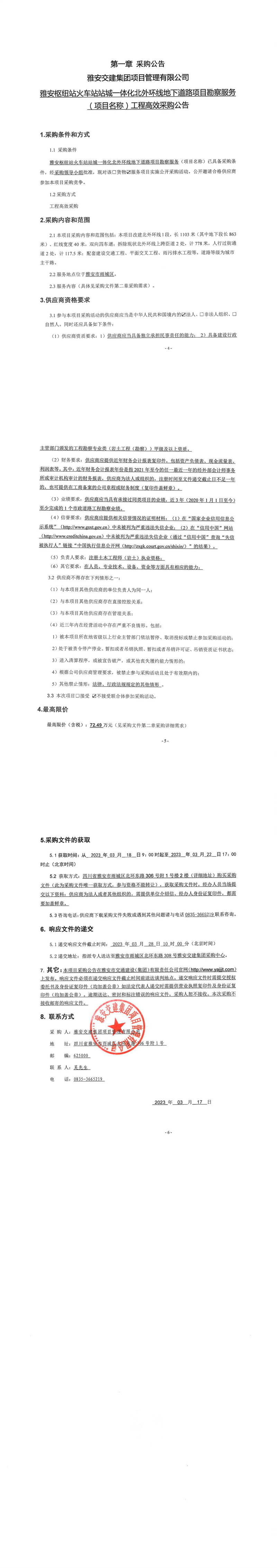 雅安交建集團項目管理有限公司雅安樞紐站火車站站城一體化北外環(huán)線地下道路項目勘察服務(項目名稱)工程高效采購公告