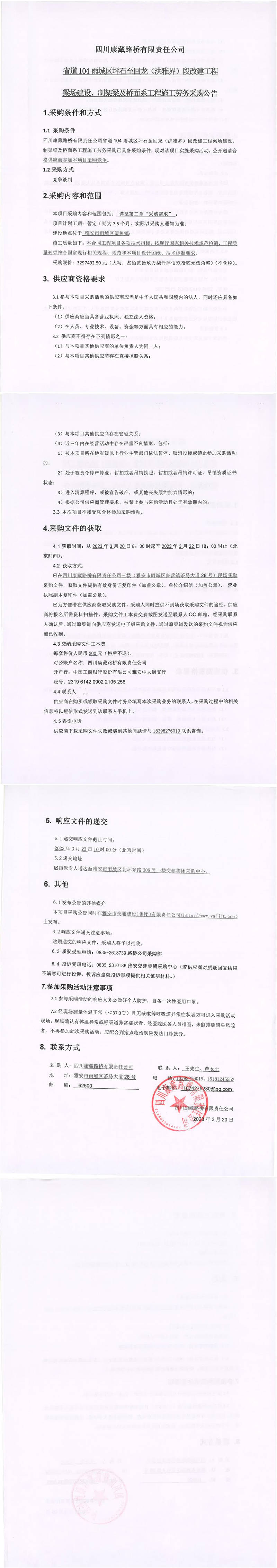 四川康藏路橋有限責(zé)任公司省道104雨城區(qū)坪石至回龍(洪雅界)段改建工程梁場(chǎng)建設(shè)、制架梁及橋面系工程施工勞務(wù)采購(gòu)公告