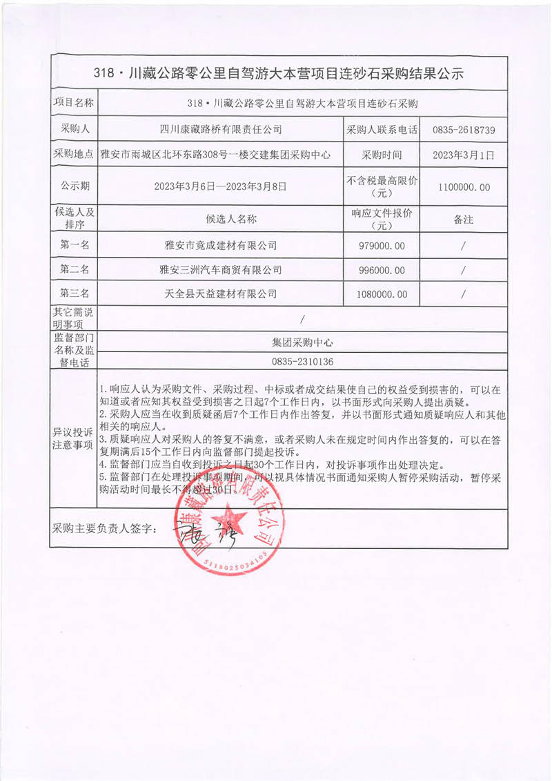 四川康藏路橋有限責(zé)任公司318·川藏公路零公里自駕游大本營項目連砂石采購結(jié)果公示