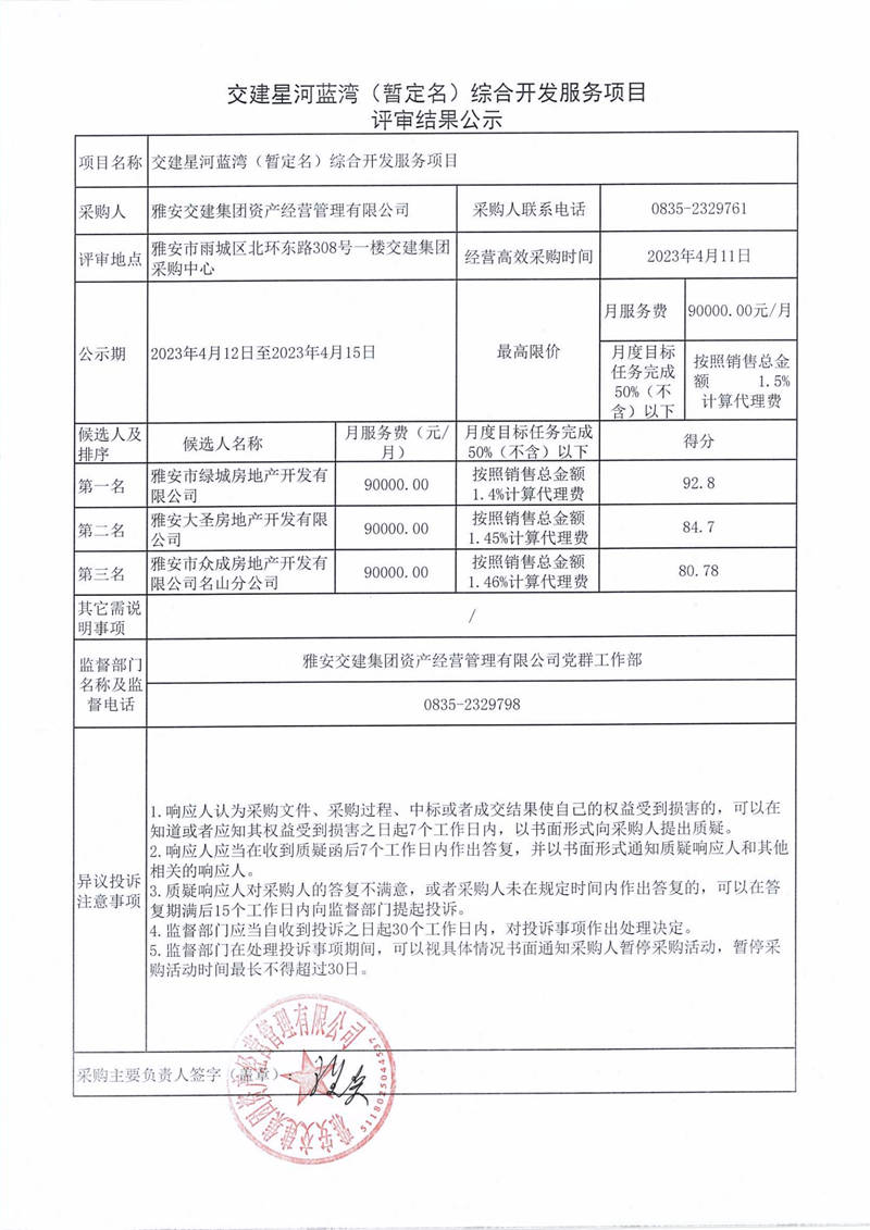 雅安交建集團(tuán)資產(chǎn)經(jīng)營(yíng)管理有限公司交建星河藍(lán)灣(暫定名)綜合開(kāi)發(fā)服務(wù)項(xiàng)目評(píng)審結(jié)果公示