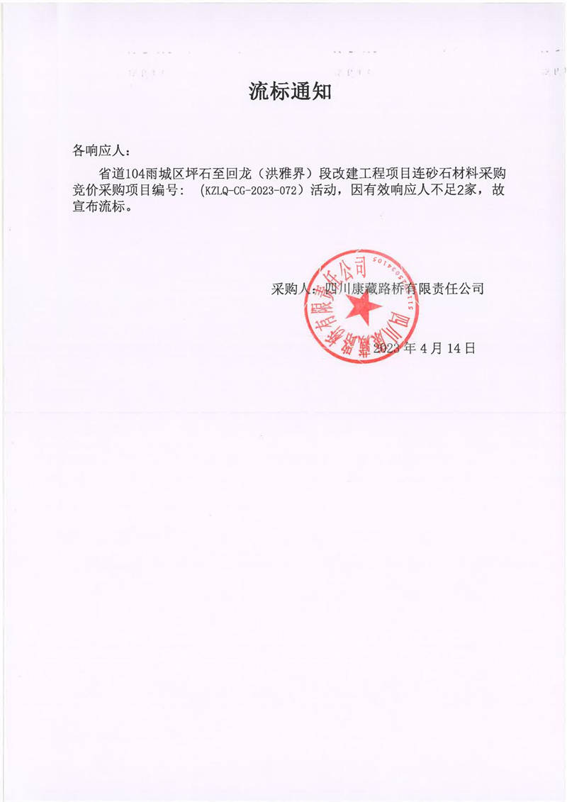 四川康藏路橋有限責(zé)任公司省道104雨城區(qū)坪石至回龍(洪雅界)段改建工程項(xiàng)目連砂石材料采購流標(biāo)通知